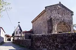 The longitudinal plan of the church is composed of a single-nave and rectangular presbytery (which is lower and narrower), with northern sacristy and tiled roof.[1] Its principal facade terminates in the gabled roof and includes a central portico on the ground floor, consisting of four columns supporting an architrave with decorative zoomorphic motifs.[1] The columns of this portico are decorated with monkeys, human figures (interpreted as the Virgin Mary and Angel Gabriel), entwined serpents and eagles with their beaks within a cornucopia. The capitals are decorated in vegetal forms or zoomorphic patterns.[1] The first archivolt has a rosetta and rings, the second monkeys, the third monoliths and human figures.[1] The tympanum includes a central figure of Christ secured by two angels.[1] These images imply a level of universal surrender of the human forms by figures within the archivolt, while others suggest that the figures represent the figures of the Apostles of Christ, who were depicted as being represented by the types of images.[1] Also problematic in this interpretation are the two figures of Mary and angel Gabriel (normally associated with the Annunciation) and who Lourenço Alves interprets as monks.[1]