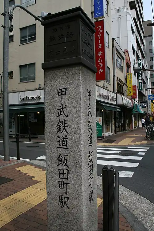 ![]() Monument for the former station reads "Kōbu Railway Iidamachi Station". | |