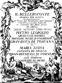Il Bellerofonte is an 18th-century Italian opera in three acts by the Czech composer Josef Mysliveček. It conforms to the serious type (opera seria) that was typically set in the distant past. The libretto, based on the Greek legend of Bellerophon, was written by Giuseppe Bonecchi.[1] The work was dedicated to King Ferdinand I of the Two Sicilies and was first performed at the Teatro San Carlo in Naples on 20 January 1767, the birthday of his father, King Charles III of Spain.[2] The cast featured two stellar singers of the time, Caterina Gabrielli and Anton Raaff, in the leading roles. The opera was only the composer's second one, and the first that permitted him the opportunity to write music for first-rate vocal artists. The production was highly successful, indeed responsible for a meteoric rise in his reputation as an operatic composer. From the time of the premiere of Bellerofonte until his death in 1781, Mysliveček succeeded in having more new opere serie brought into production than any other composer in Europe. During the same time span, he also had more new operas staged at the Teatro San Carlo in Naples than any other composer.