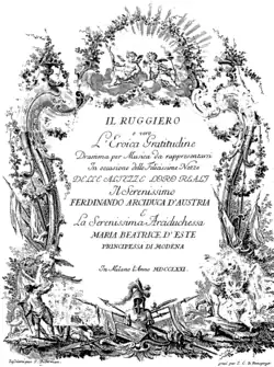 Il Ruggiero (full name: Il Ruggiero ovvero L'eroica gratitudine) is an opera in three acts composed by Johann Adolph Hasse to a libretto by Pietro Metastasio. It was first staged on 16 October 1771 for the wedding of Archduke Ferdinand Karl with Maria Beatrice d'Este in the Teatro Regio Ducale, Milan.[1] It was both Metastasio's last libretto and Hasse's last opera, as well as the thirty-second Metastasio libretto Hasse had set to music.[2][3]