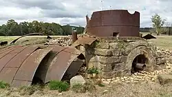 Approximately three metres of the lowest part of the blast furnace is still standing; the stone base and hearth—including the three tuyere ports and the three tuyere pipes—and the lowest part of the iron shell are in place. Lying on the ground, adjacent to the furnace, is the iron shell from the collapsed upper part of the furnace,[30][31] which sheared off the furnace structure when a large tree fell on it.[32] The fallen tree lay over the furnace in 1969[33] but is now gone.[31] The area immediately adjacent to the furnace base is strewn with fire bricks. An unused cast iron tapping block from the old furnace survives[34] and is on display at the Beaconsfield Mine & Heritage Centre.[35]