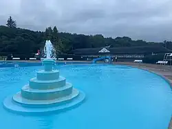 The large pool is mushroom shaped with a shallow area for children, including slide, and deeper circular area 46 m in diameter.[3] There is also a 'rare example of a still unscreened fountain' which was part of the original filtration system.[3] The pool's Art Deco café[4] built in August 1935 to cater for 100 people remains unchanged externally[3] with glazed concertina doors and raised sun terrace that reflect the 1930s enthusiasm for outdoor leisure.[2]
