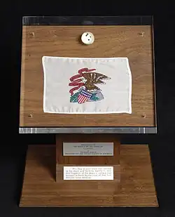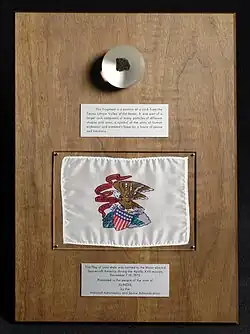 At the request of Nixon, NASA had about 250 presentation plaques made following Apollo 11 in 1969. Each included about four rice-sized particles of Moon dust from the mission totaling about 50 mg.[1][2] The Apollo 11 lunar sample display has an acrylic plastic button containing the Moon dust mounted with the recipient's country or state flag that had been to the Moon and back. All 135 countries received the display, as did the 50 states of the United States and the U.S. provinces and the United Nations.[1]