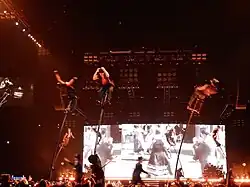 "Illuminati" was part of the setlist of Madonna's Rebel Heart Tour (2015–16).[37] After the acoustic performance of "Rebel Heart", Madonna leaves the stage for a costume change; her dancers perform "Illuminati" while perched on sway poles that bend with the wind.[38] Jordan Zivitz of the Montreal Gazette praised the performance, writing that the dancers "nearly stole the show in their employer's absence during another costume change, set to Illuminati's woozy thump".[38] George Varga of The San Diego Union Tribune said the audience "cheered with notably more enthusiasm" during the performance.[39]