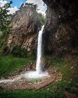 After two attractive Ilomska waterfalls, the river flows into the Ugar, a few kilometers downstream from Vitovlje village. The height of the bigger water flow is even (around) 40 meters (130 ft). Waterfalls in this wilderness attract mountain-climbers, tourists and fishermen, and the vertical rocky wall under the river's falls is suitable for alpinist exercises.[5][6][7]