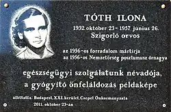 Ilona Tóth (23 October 1932 – 27 June 1957) was a Hungarian medical student and revolutionary. She participated in the Hungarian Revolution of 1956 and subsequently joined the resistance against communist rule, where she was involved in producing propaganda pamphlets. Tóth was arrested for her printing activities in November 1956, and she was charged as a co-conspirator in a murder carried out by the resistance. She was found guilty, and was executed on 27 June 1957. Tóth's death made her a martyr for the anti-communist cause in Hungary. Her image was rehabilitated after the fall of the communist government in the 1990s, and she was one of many Hungarian dissidents exonerated through "Ilona Tóth's law" in 2000. The extent of her involvement with the murder remains a subject of dispute.