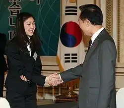 In 2012, Kim was awarded the Moran Medal of the Order of Physical Education, the second-highest grade in South Korea's Order of Civil Merit, for her contributions to the 2018 Pyeongchang bid.[51] In 2013, she received an achievement award from her alma mater, Korea University, for "significantly raising the honor and dignity" of both the university and the country; she was also awarded her diploma during the ceremony because she was unable to attend her graduation ceremony due to her participation in the 2013 World Championships.[52] She was later awarded the Blue Dragon Medal (Cheongnyong) at the 54th Korea Sports Awards, the highest decoration in the Order of Sports Merit, in October 2016. Kim was not originally eligible for the honor, having already received a different order less than seven years prior, but an exception was made in light of her achievements.[53] She became the youngest and only winter sports athlete to be inducted into the Korean Sports Hall of Fame the subsequent month.[54] Following the 2018 Winter Olympics, along with the unified women's ice hockey team of North and South Korea, she received the Outstanding Performance Award at the ANOC Awards.[55] Kim received the Korea Image Cornerstone Award at the 19th Korea Image Awards alongside Squid Game actor Lee Jung-jae and swimmer Hwang Sun-woo on January 11, 2023.[56]