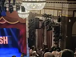 A sounding board is placed on the ceiling above the proscenium arch. The sounding board contains a band with foliate ornamentation, with a latticework panel at the center.[20] The rest of the ceiling contains a slight curve and shallow coves, which were intended to give the theater an intimate feeling.[17][26] The ceiling is slightly higher than the sounding board, creating a rib near the front of the auditorium, where the ceiling steps down to the sounding board. The front rib contains Adam-style bas-relief plaster decorations, as well as circular bas-relief medallions. The rest of the ceiling contains panels surrounded by decorative bands, with medallions in the center of each panel. The panels are divided by ribs with decorative bands.[27] Chandeliers were originally suspended from the ceiling panels, and there is low relief decoration throughout.[27][14] The modern ceiling has replacement chandeliers as well as air-conditioning grates.[27]