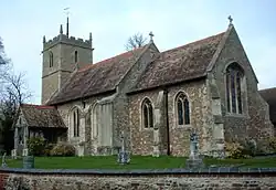 The original building was constructed about 1130 and appears to have been dedicated originally to St Etheldreda. Its first use was not as a church for the parish but to transcribe books for the prior of Ely. The first vicar was not appointed until the 13th century and since then it has been mainly rebuilt in the 14th and 15th centuries. The church was built of fieldstones and masonry rubble and the stones from the original building can still be seen.[12] The original churchyard wall was built in 1614 but this crumbling wall was replaced in 2005 after a £50,000 grant from the Heritage Lottery Fund.[13] The tower contains three bells at least two of which date from the 15th century.