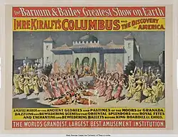 Imre Kiralfy’s The Fall of Rome was produced on Staten Island with 2,000 performers, a grand number at the time. In 1892, to mark the 400th anniversary of Columbus' "founding" of America, he produced Columbus and the Discovery of America at the Madison Square Garden Theatre. It was later featured at the Auditorium Theatre at the Chicago World’s Columbian Exposition. Imre Kiralfy also premiered his show America at the Chicago World’s Fair which was picked up by the Metropolitan Opera House in 1893. Life magazine in quoted as response to the production “Kiralfy out-Kiralfy’s himself”[35] Imre Kiralfy then moved to England where he created even larger spectacles.[36] The twenty-four acre Earl's Court Exhibition Centre grounds were rebuilt in 1894 by Imre Kiralfy in a Mughal Indian style. The Empire of India Exhibition opened the site in 1895, and was the first of a series of annual exhibitions there, which drew heavily on the abundance of transport links in the area to attract a mass audience. Highlights of the site included the two-storey Empress Hall, built for Kiralfy in Fulham which could seat 6,000 viewers for his spectaculars, and the 300-feet high Great Wheel whose forty carriages could each accommodate thirty people.[37][38] Imre Kiralfy became a British citizen in 1901.[39] The renowned producer died on April 27, 1919, at age 74 in Brighton, England.[40] He is buried in the family mausoleum in Green-Wood Cemetery, New York, but there is also family mausoleum at Kensal Green Cemetery in London.