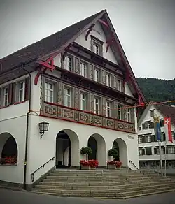 In 1590 Hans Indermaur, a tanner from Berneck, resettled in Rheineck.[26][7] Indermaur's house was purchased in the 1700s by the municipality of Rheineck and was converted into an orphanage. The building is now a historic landmark and the house's cellar, once used as a tannery, is now a performance venue.[27] As vassals, the In der Maurs were granted fiefdoms and owned vineyards in Berneck and Rheineck.[5] On 19 March 1655, a tanner named Jakob Indermaur von Rheineck was granted a fief near Reben am Schwerzenberg.[28] He was granted another fief, in Strenglen, on 24 June 1689.[29]