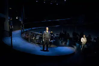 After the original Akalaitis production performed in Seattle, Chicago and New York City, subsequent ones have varied the number of non-speaking roles and the placement of the string ensemble. The Opéra National de Lyon production directed by Richard Brunel added a second non-speaking guard.[7] The Music Theatre Wales production directed by Michael McCarthy eliminated the guard's role completely.[12] The Australian production directed by Imara Savage placed the string players off-stage and set the action in a hospital-like corridor.[10] None of these later productions used the Kafka narrator.
