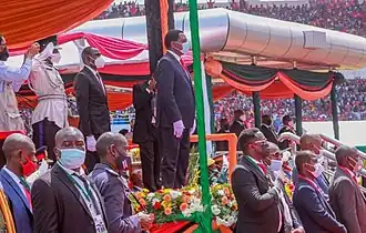 The inauguration of Hakainde Hichilema as the 7th president of Zambia was held on 24 August 2021.[1] President-elect Hichilema won by a landslide with over 996,000 votes between him and the Incumbent president Edgar Lungu who got 1,814, 201 votes in the August 2021 presidential election.[2][3] Hakainde Hichilema took the oath alongside Mutale Nalumango as the vice-president of Zambia. The venue for the inauguration was National Heroes Stadium in Lusaka. Attendance was supposed to be restricted to invited guests only due to the COVID-19 preventive protocols, but was later made open to the public resulting in a filled out stadium[4] The day of the inauguration was declared a public holiday in Zambia by president Edgar Lungu.[5]