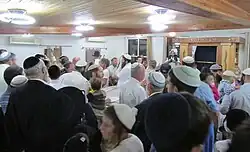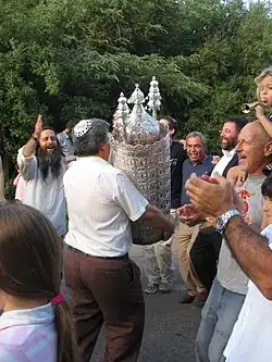 The Torah scroll is carried to its new home in an outdoor procession attended by men, women, and children.[11][24] The procession can take place by day or by night. This event can attract hundreds[25][26][27] and even thousands of participants.[28][29]