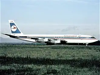 Independent Air first aircraft was a DC-7B (N4889C), that was taken over from Skylarks Enterprises Inc.[1]. In 1970, the DC-7 was replaced by a Boeing 720-022 (N7228U) later accompanied by N7229L in 1981.[8] In 1976, Atlanta Skylarks purchased two Sud SE-210 Caravelle VI-R aircraft (N555SL and N777VV) from Transavia.[8] After the name change from Atlanta Skylarks to Independent Air, the company acquired two Boeing 707-331Bs from TWA (N7232X and N7231T). Initially, the company was not granted permission to use the 707s in the US since their engines were not fitted with hush kits. In 1986, Independent Air added a Boeing 727-100 (N154FN) to their fleet but this aircraft was returned to the lessor before the end of that year. Independent Air also leased a Boeing 707 from Skystar International (N728Q) in 1987. The fleet's mainstays (N7231T and N7232X) were sold to International Air Leases Inc. in 1988 and leased back. The Boeing 707 N7231T that was lost in the Azores was replaced in 1989 by a 707 from Denver Ports of Call (N457PC). Both aircraft were returned to International Air Leases in 1990, when Independent Air ceased operations.