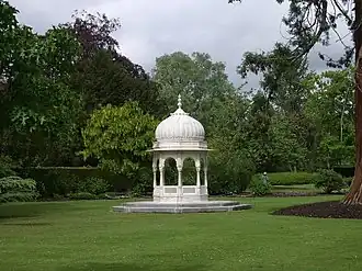 The kiosk is constructed entirely in marble with open arches and an onion dome roof.[14] Geoffrey Tyack, Simon Bradley and Nikolaus Pevsner, in their Berkshire volume of the Buildings of England series, describe it as a “pretty, octagonal domed pavilion of white marble”.[12] The garden historian George Plumptre notes its “exquisite oriental symmetry”.[15] The kiosk is a Grade II listed structure.[14] Teulon's Teahouse also has a Grade II listing[16] while James Wyatt's nearby Gothic Ruin is designated Grade II*.[17]