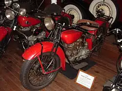 Designed by Charles B. Franklin,[1][3] the Scout was introduced in October 1919 as a 1920 model. The Scout had a sidevalve V-twin engine with its transmission bolted to the engine casing, allowing a geared primary drive - the only American v-twin to use this maintenance-free system.[4] The Scout engine initially displaced 606 cc (37 cu in), but the engine size was increased to 745 cc (45 cu in) in 1927 in response to the popularity of the Excelsior Super X.[1][5] In early 1928, a front brake was added to the Scout.[6]