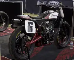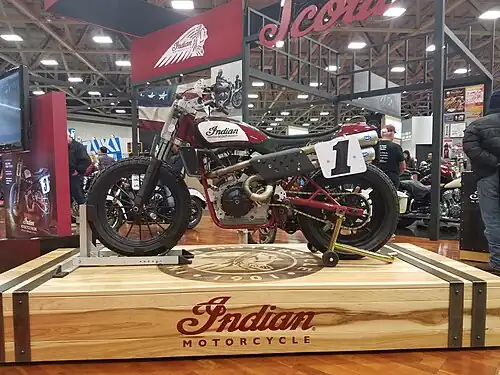 The Indian Scout FTR750 is a competition-only motorcycle engine made by Indian Motorcycle for flat track racing. It is a fuel-injected, liquid-cooled, four-valve-per-cylinder V-twin.[1] A single-pin crankshaft riding on plain bearings carries side-by-side steel connecting rods.[2] It is the first all-new flat track racing motor from Indian Motorcycle in decades.