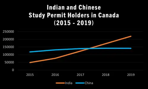 The number of Indian students in Canada exceeded the number of Chinese students in Canada in 2018, with the Indian student population quadrupling between 2015 and 2019.[32] The number of Indian students in Canada increased from 48,765 in 2015 to 219,855 in 2019, constituting 34% of Canada's foreign student population.[32]