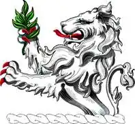 Crest of the Harrison family, used for Indiana Army National Guard Regiments, depicting a wreath of colors, a demi-lion rampant Argent, holding in dexter paw a laurel branch Vert[5]