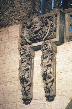 The building is six stories and is of concrete frame construction. The front of the building is sheathed in white terra cotta. The main feature of the facade is the curving triangular arch with churrigueresque framing that fills the central bay above the marquee. The original marquee is still in place. The basement originally contained bowling alleys and billiard rooms. Upper floors were divided between office space and theater space. The interior included an entrance lobby, 2+1⁄2-story main lobby and a 3,200-seat auditorium. The auditorium was distinguished by elaborate plaster ornamentation based on Spanish Baroque motifs. The building is topped by the Indiana Roof Ballroom, a large atmospheric ballroom decorated to resemble a square surrounded by buildings with a stage at one end. The ballroom has an elliptical dome with sky effects. The theater is a major example of the American motion picture palace.[2] The building was restored and the auditorium was extensively remodeled in 1979–80 to accommodate the needs of the Indiana Repertory Theatre.