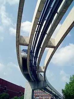 There are two separate parallel elevated guideways side-by-side, both of which operate in both directions. Each guideway uses two concrete rails, with an open space between. This technology is similar to a monorail, but technically distinct.[5]
