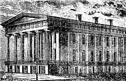 The first joint Masonic temple in the city, a colonnaded Greek Revival hall, was built in 1850. The building was the site of the Indiana Constitutional Convention of 1850 that met to draft a new state constitution. The state government rented the Masonic temple for the gathering because the House of Representative in the Indiana Statehouse was too small to accommodate the 150 convention delegates.[3]