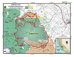 The Indians Fire was a wildfire in the Ventana Wilderness of the Los Padres National Forest in the Santa Lucia Range which that started on June 8, 2008 and burned uncontained until July 10 scorching 81,378 acres (329.33 km2) of land.[1] This fire burned predominantly within the Los Padres National Forest, Monterey Ranger District, inside the Ventana Wilderness. Other affected properties include portions of Fort Hunter Liggett military base and private property. The suppression cost exceeded $40.7 million, not including resource damages and rehabilitation costs.