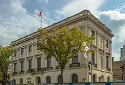 The building's design, by American architect Cass Gilbert, reflects the Beaux-Arts classical style, and is reflective of typical United States government architecture of the early 1930s.[1] Consisting of three storeys, the building's "... rectilinear footprint, flat roof, and symmetrical composition centred on the main entrance of the principal elevation… possesses a simple, imposing cube-like massing".[2] The spatial hierarchy of the building maintains the Beaux-Arts characteristics of grand circulation spaces that lead to principal offices, while corridors of secondary and tertiary importance lead to other office and support spaces.[1] The building is finished in Indiana Limestone, and features finely carved classical details on its principal facades, while Vermont marble, and floor-to-ceiling oak panels fashion the interior spaces.[3] The building fits "...harmoniously within a row of similarly scaled and finished buildings", all of which face the Parliamentary Precinct.[1] On January 8, 1985, the building was recognized by the Government of Canada as a Classified Federal Heritage Building[2] and is listed on the Canadian Register of Historic Places.[4]