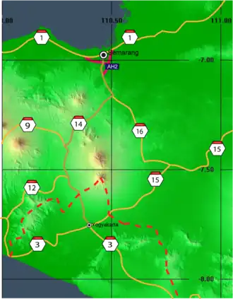 Indonesian National Route 14 starts from Semarang on the north coast of Java and ends at Yogyakarta to the south.[1][2]