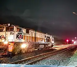 Semboyan 45 is a shunting signal which during the day is a red skip on the front left end and the rear right end of the locomotive or vice versa and at night is a spotlight on and a yellow signal light on the front of the locomotive on the right side lights up white. Semboyan 45 indicates that the locomotive carrying the signal is/will be performing shunting service. |