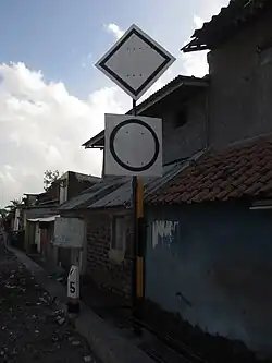 - Semboyan 2: Signature in the form of a rhombus with a yellow number symbol in the middle on a black background with a yellow border indicating that the train line to be passed has a speed limit according to the number symbol shown multiplied by 10 (eg: 6, meaning 60 kilometres per hour (37 mph)), and trains passing through it must adjust their speed according to the maximum speed limit (taspat) indicated by it.