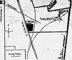 The plans continued with the election of officers for the newly-formed Industrial Development Company in June 1907, following its purchase of 200 acres of land at the site.[2][3] Alongside the development of factories in the area, the investors planned to extend the streetcar service from Krug Park towards the industrial site.[3] Costs for the single line extension were estimated at US$12,000,[4] and it was officially opened on October 1, 1908.[5]