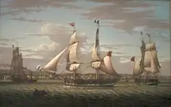 With tariffs with England abolished, the potential for trade for Scottish merchants was considerable, especially with Colonial America. However, the economic benefits of union were very slow to appear, primarily because Scotland was too poor to exploit the opportunities of the greatly expanded free market. Scotland in 1750 was still a poor rural, agricultural society with a population of 1.3 million.[18] Furthermore, Scotland's economy had been ravaged by the Darien scheme: according to some estimates, half of all the circulating wealth in Scotland went into the scheme. Glasgow merchants had been particularly enthusiastic, and consequently had no ships of their own for twenty years following the disaster.[19] Some progress was visible, such as the sales of linen and cattle to England, the cash flows from military service, and the tobacco trade that was dominated by Glasgow after 1740. The clippers belonging to the Glasgow Tobacco Lords were the fastest ships on the route to Virginia.[20] The trade had started as smuggling during the 1600s, but with the Act of Union, it became legal and trade picked up.[21] Merchants who profited from the American trade began investing in leather, textiles, iron, coal, sugar, rope, sailcloth, glassworks, breweries, and soapworks, setting the foundations for the city's emergence as a leading industrial centre after 1815.[22] The tobacco trade collapsed during the American Revolution (1776–1783), when its sources were cut off by the British blockade of American ports. However, trade with the West Indies began to make up for the loss of the tobacco business,[23] reflecting the extensive growth of the cotton industry, the British demand for sugar and the demand in the West Indies for herring and linen goods. During 1750–1815, 78 Glasgow merchants not only specialised in the importation of sugar, cotton, and rum from the West Indies, but diversified their interests by purchasing West Indian plantations, Scottish estates, or cotton mills. They were not to be self-perpetuating due to the hazards of the trade, the incident of bankruptcy, and the changing complexity of Glasgow's economy.[24] Other burghs also benefited. Greenock enlarged its port in 1710 and sent its first ship to the Americas in 1719, but was soon playing a major part in importing sugar and rum.[25]