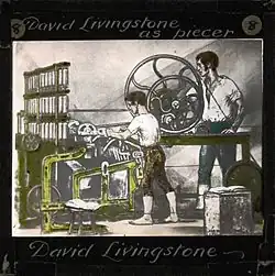 From about 1790 textiles became the most important industry in the west of Scotland, especially the spinning and weaving of cotton. The first cotton spinning mill was opened at Penicuik in 1778. By 1787 Scotland had 19 mills, 95 by 1795 and there were 192 by 1839. The rise of cotton was the result of a sudden fall in the price of the raw materials because of slavery, mostly imported from the US, and the availability of a pool of cheap labour caused by population rise and migration. In 1775 137,000 lb of raw cotton were being imported into the Clyde and by 1812 it had increased eightfold to over 11 million lb. The capital invested in the industry increased sevenfold between 1790 and 1840.[34] By 1800, cotton was the main industry in the Glasgow area: New Lanark mills were at the time the largest in the world.[35] Early production was aided by the new technology of the spinning mule, water frame and water power.[2] Steam powered machines were introduced into the industry from 1782.[34] However, only about a third of workers were employed in factories and it continued to rely heavily on the hand loom weaver, working in his own home. In 1790 there were about 10,000 weavers involved in cotton manufacture and by 1800 it was 50,000.[36] The cotton industry flourished until in 1861 the American Civil War cut off the supplies of raw cotton.[37] The industry never recovered, but by that time Scotland had developed heavy industries based on its coal and iron resources.[38]