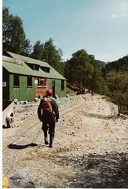 Gold was found in the Dolgellau area in the 1850s and a mining rush developed. The first gold was discovered at Gwynfynydd in 1863, but it was not until 1887 that the mine was developed commercially.[4] By this time the mine had been acquired by William Pritchard Morgan, who was to become known as the "Welsh gold king", and who paid for two police constables to protect the mine.[5] By 1888, two hundred people were employed at the site, the gold being extracted by driving horizontal tunnels (adits) into the mountainside, with the miners working deep underground by candlelight. The machinery was powered by water wheels and water turbines. In contrast to other mines in the area where the gold was found in shallow deposits, the Gwynfynydd gold is extracted from large quartz veins deep underground.[4]