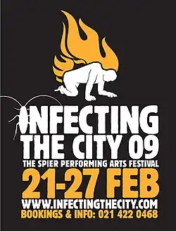 The festival started as Infecting The City Performing Arts Festival in 2008 with a "singular aggressive aim – to infect the city with performance that captures the complexities of our daily lives".[4] The Festival was born to migrate some of the experiences of the now-disbanded Spier Summer Season on the Spier Wine Farm to the central part of Cape Town. The annual Spier Summer Season first started in 1996 and included diverse performances such as opera, comedy, poetry and music over a three-month period each year. In 2007, the Spier Arts Trust, the organisation which produced the Summer Season, discontinued the project. The Africa Centre, with funding from Spier, decided to continue the spirit of the Summer Season by creating a week-long performance art festival in the centre of Cape Town. Brett Bailey has curated the 2009, 2010 and 2011 iterations of the Infecting The City Festival.Jay Pather curated the festival in 2012