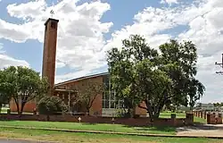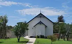 Our Lady of the Southern Cross Catholic Church is on the western corner of George and Elizabeth Streets (28°24′49″S 151°04′50″E / 28.4136°S 151.0806°E / -28.4136; 151.0806 (Our Lady of the Southern Cross Catholic Church, Inglewood)).[28]