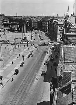 - the 361 meter long (1184 ft.) eastern section[13] of the Goerdelerring (named after the Mayor of Leipzig, Carl Friedrich Goerdeler; formerly the separate Fleischerplatz and Schulplatz squares, which were combined into Friedrich-Engels-Platz in 1945), which follows the course after passing the "round corner"-building[14] continues in a north-easterly direction - the section of the Geordelerring running west between Pfaffendorfer Straße and Jacobstraße and merging into the Ranstädter Steinweg can, because of the after World War II changed road layout are no longer assigned to the actual inner city ring road,
