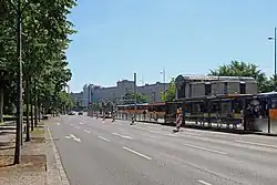 Depending on the section, the inner city ring road had a traffic volume of 26,000 to 50,000 vehicles/24 hours in 2015.[15] The inner city ring is the innermost ring in the ring system of the Leipzig road network (see figure Ring roads in Leipzig). The figure shows the so-called Tangentenviereck as a further ring, then the (unfinished) Mittlerer Ring (middle ring), highlighted in colour, and the Autobahn[16] on the very outside. Bundesstraße 6 (Willy-Brandt-Platz) and Bundesstraße 87 (Tröndlinring) run over the inner city ring road. The Bundesstraße 2 also ran over the inner city ring road before from the Berlin bridge in the north the connection via Rackwitzer Straße, the east and south side of the Tangentenviereck was passable. The degree of expansion of the inner city ring corresponds to this high traffic volume (72,800 vehicles / 24 hours at the Gerberstraße junction (Hallesches Tor), 30,700 vehicles / 24 hours at the Thomaskirchhof / Gottschedstrasse junction).[17]