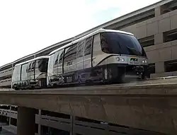 - PHX Sky Train (2013) – Built in three phases.[1] Phase 1 opened April 2013, connecting the Valley Metro Rail station to the East Economy Parking Garage and Terminal 4. Phase 1A opened December 2013 extending the line to Terminal 3, with a covered walkway to Terminal 2. Phase 2 extended the line to the Rental Car Center, and opened in 2022. Now fully completed, the length of the line is 2.17 miles (3.49 km), serves 5 stations, and has a total of 18 vehicles.[3]