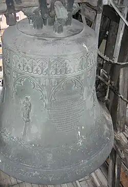 The cathedral contains eight bells, the largest bell or bourdon is called the Mariahilfglocke (Große Pfarrglocke) and it is the second largest historic bell in Tyrol. It was cast in 1846 by the Grassmayr Bell Foundry. The Mariahilfglocke has a diameter of 2,210 mm (87 in) and weighs 6,342 kg (13,982 lb). The bourdon is housed in the north tower of the cathedral and tolls every Friday at 3:00 pm to note the hour Jesus died.[28]In 1961 and 1965, seven new bells were cast by Johann Grassmayr from Grassmayr Bell Foundry and acquired by the cathedral for the south tower—six dedicated to various saints and the seventh named Totenglocke (Death knell).[28] Two of the eight bells serve as clock bells, Bell 3 strikes every quarter hour, and the bourdon strikes the number of a full hour. During Angelus, the hour chime is not played. In Austria, the bells are always numbered from largest to smallest, Bell 1 is always the tenor or bourdon.