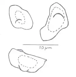 The irregularly shaped spores measure from 7.2 to 11.6 by 5.1 to 7.9 micrometres (μm), each featuring a few thick protrusions.[4] Abnormal spores of a different shape, sometimes with protrusions more distinct from the actual spore than is typical, can sometimes form; this is perhaps due to poor weather.[5] The club-shaped basidia measure 25 to 40 by 9 to 14 μm, and each basidium bears four spores. The yellowish pleurocystidia (cystidia on the face of the gill) are ventricose or occasionally club-shaped, measuring 41 to 89 by 12 to 23 μm, including a cell wall up to 4.5 μm thick. The tip often bends and is encrusted with crystal-like structures, while the base tapers, or narrows into a small stalk.[4] The cheilocystidia (cystidia on the edge of the gill) are much the same, but they are typically somewhat shorter and stouter.[9] The longer caulocystidia (cystidia on the stem) occur all the way down the stem and measure up to 99 μm in length with a more variable shape. The mushrooms also feature "paracystidia", club-shaped cystidia-like structures on the gills lacking crystals, as well as "cauloparacystidia" on the stem. In Inocybe saliceticola, the paracystidia are fairly abundant, with thin cell-walls, while the abundant cauloparacystidia can have slightly thicker walls and are often arranged in clusters.[10]