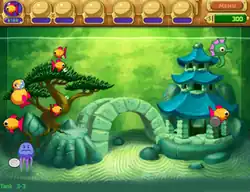 Insaniquarium can be played in four modes: Adventure, Time Trial, Challenge, or Virtual Tank. In Adventure mode, a player advances through four tanks, each with five levels.[2] In each level, the player must earn enough money to buy three egg pieces to advance to the next level. During an initial playthrough of Adventure mode, at the end of each level of a tank, the player receives a new pet from the egg.[5] While 24 pets can be earned throughout Adventure mode,[6] each level requires the player to pick three pets.[4] Each pet can aid the player during gameplay.[5] There are bonus rounds where the player can collect shells, which can be spent to place fish in the Virtual Tank.[5]