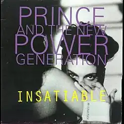 "Insatiable" is a song by American musician Prince and The New Power Generation, from their 1991 album Diamonds and Pearls.[3] It is a slow, simmering ballad that often draws comparisons to 1989's "Scandalous!". The B-side was "I Love U in Me", which was originally the B-side to "The Arms of Orion". "Insatiable" was only released in the US as a 7" single, a 12" promo was sent only to Urban radio stations, and the track was not released to Pop radio stations. It performed well on the R&B chart, reaching number 3, but did not break the top 40 on the US Pop chart. Its single sales were moderate, and it received heavy airplay on Urban and UAC radio stations, but it did not make the Hot 100 Airplay (the R&B airplay chart did not appear until spring 1992).
