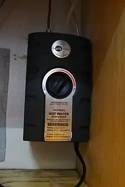 An instant hot water dispenser or boiling water tap is an appliance that dispenses water at about 94 °C (201 °F) (near-boiling). There are hot-only and hot and cool water models, and the water may be filtered as well as heated. Instant hot water dispensers became popular in the 1970s. Instant hot water dispensers are very similar to portable shower devices; the latter is fitted with a heating element and quickly heats up water, once a switch has been activated.