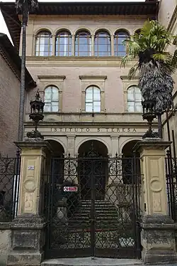 The complex and the oratory were commissioned by the Monsignor Leopoldo Bufalini as a school for girls. Construction in a Neo-Renaissance style took place between 1877 and 1885, using designs by Giuseppe Partini.[1][2] The entrance archways lead to a double ramp stairwell with loggia decorated by Giorgio Bandini and L. Mazzuoli in 1875-1880. In the reception hall were frescoes by Ricciardo Meacci.