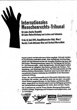 - ^ Internationales Menschenrechts-Tribunal: 50 Jahre Zweite Republik – 50 Jahre Unterdrückung von Lesben und Schwulen. Wien, 9. bis 12. Juni 1995, Vorsitz: Freda Meissner-Blau und Gerhard Oberschlick.[Programme of the Tribunal]