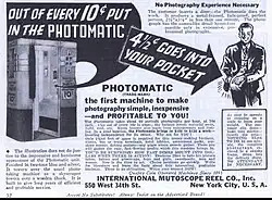 The company also produced arcade photo booths under the name of "Photomatic". These produced a souvenir 2-5/8" x 3-1/16" metal-framed photo with the credit on the back, "Taken by the Photomatic."