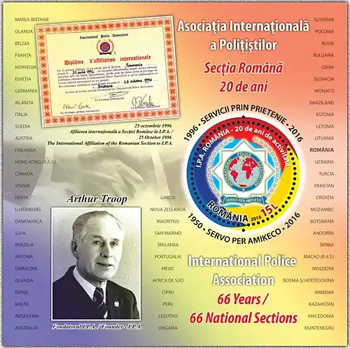 The IPA was founded by Lincolnshire Police officer Arthur Troop in 1950. In 1949, Troop wrote an article published in the British Police Review under the pseudonym of Aytee. By January 1, 1950, the IPA was established with the Esperanto motto "Servo per Amikeco," or "Service Through Friendship." Troop became the first secretary general of the British section of the organization and later the first international secretary general. In 1966, he resigned from that role for unspecified personal reasons.[4]